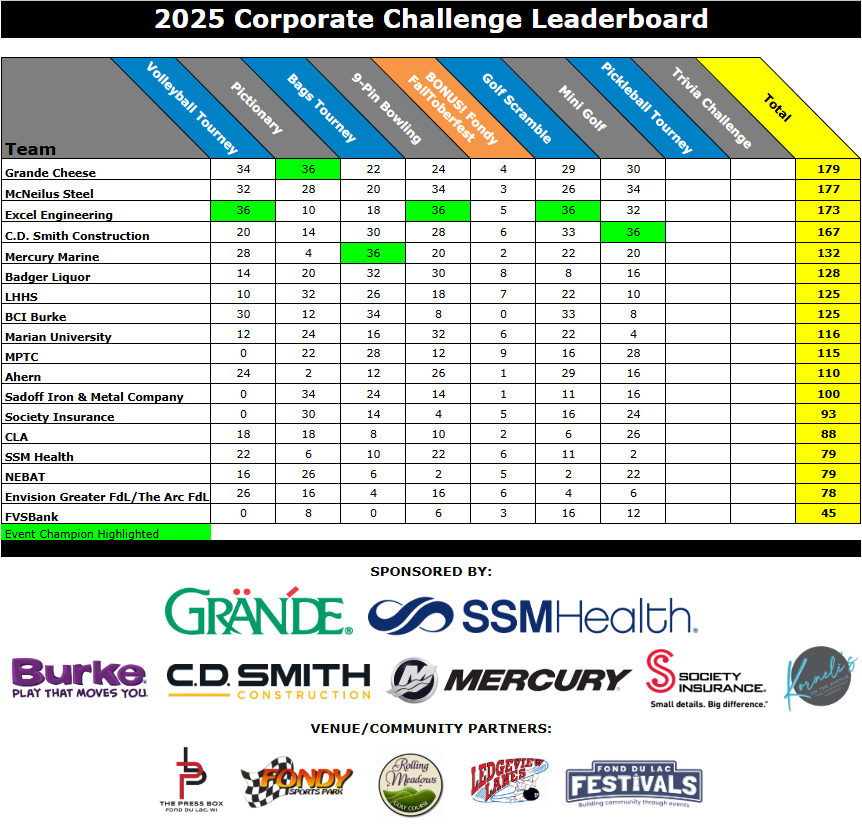 The Fond du Lac Corporate Challenge encompasses a ton of fun, competitiveness and camaraderie amongst area businesses taking place over a 10-week period from late August through late October/early November. Small and large businesses alike are invited to join in this friendly competition with an overall mission to help promote healthy living.